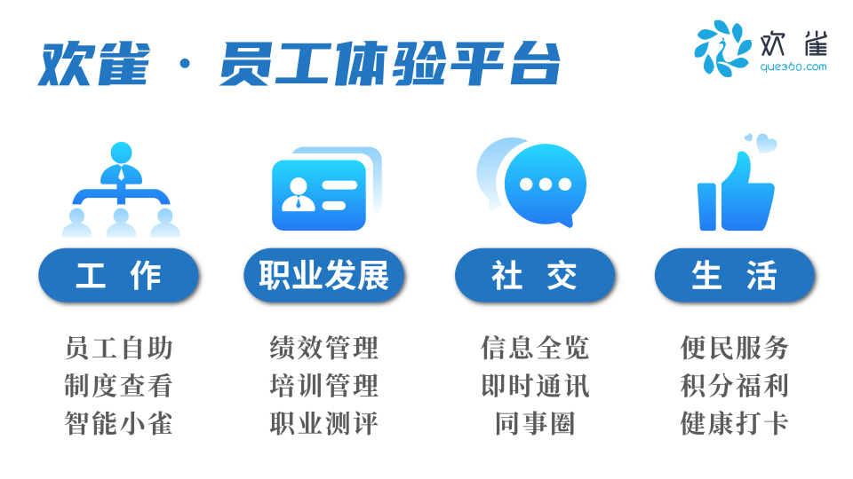 中國的員工體驗(yàn)平臺(tái)還在不斷向前發(fā)展當(dāng)中,如何充分發(fā)揮員工體驗(yàn)平臺(tái)的能力,協(xié)助人力資源管理者吸引及留住員工,歡雀科技愿和各位HR不斷嘗試、實(shí)踐、突破!打造更好的員工體驗(yàn)平臺(tái)!
