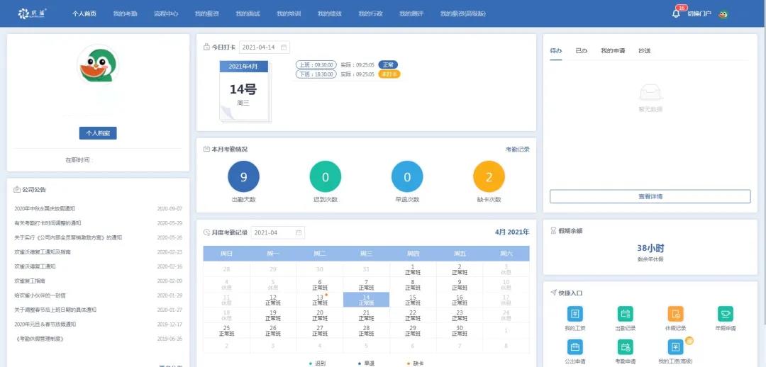 員工自助:員工可進(jìn)行個(gè)人信息查詢、查閱公司通知、下載公司通用文件;支持薪資查詢、福利查詢、休假申請(qǐng)、加班申請(qǐng)、培訓(xùn)申請(qǐng)/反饋等;經(jīng)理可以查詢下屬員工的基本信息,并可進(jìn)行各項(xiàng)工作的審批,如休假/加班審批、考勤審核、培訓(xùn)審批、在線評(píng)估等。