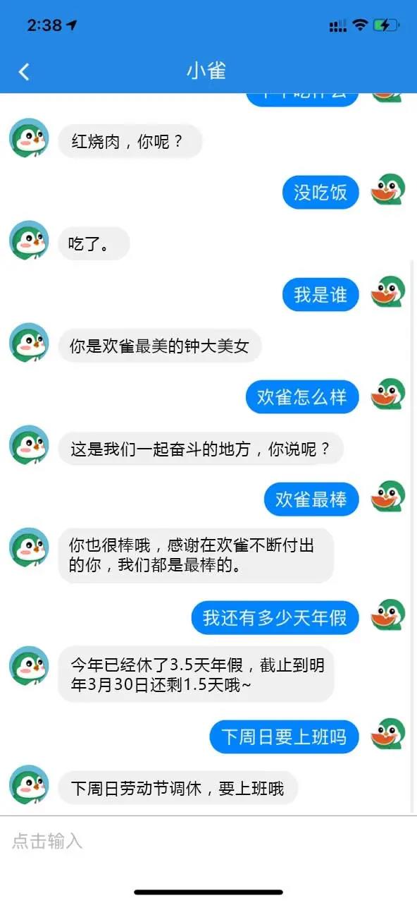 智能小雀:通過基于人工智能的“對(duì)話”技術(shù),員工可以在手機(jī)端找到智能小雀并與它在線溝通,自助完成信息的查詢和流程的辦理。