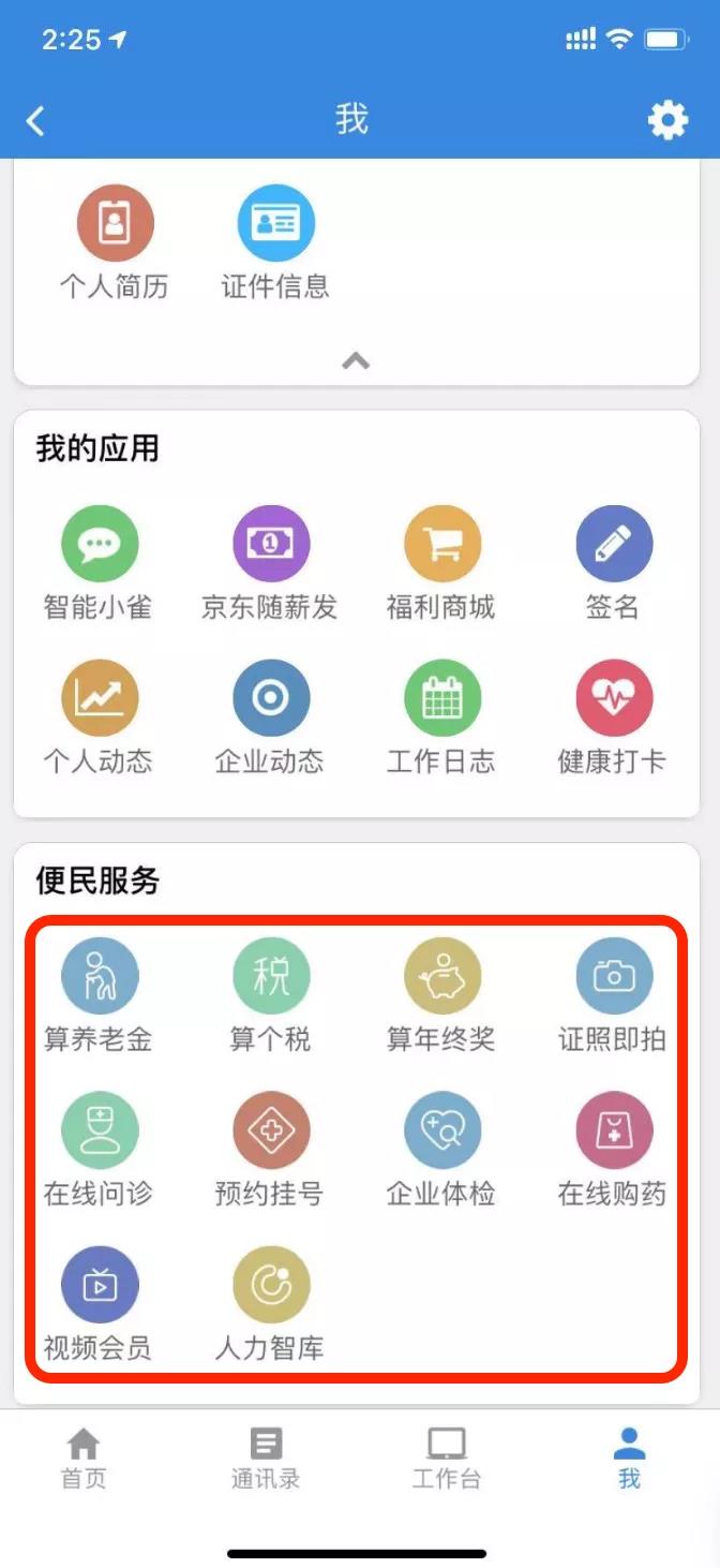 便民服務(wù):可以在移動(dòng)端一鍵觸達(dá)各類服務(wù):體檢、個(gè)稅計(jì)算、證件照、就醫(yī)掛號(hào)、視頻會(huì)員、內(nèi)容學(xué)習(xí)等;同時(shí)還可以健康信息打卡,企業(yè)健康統(tǒng)計(jì)一鍵完成。